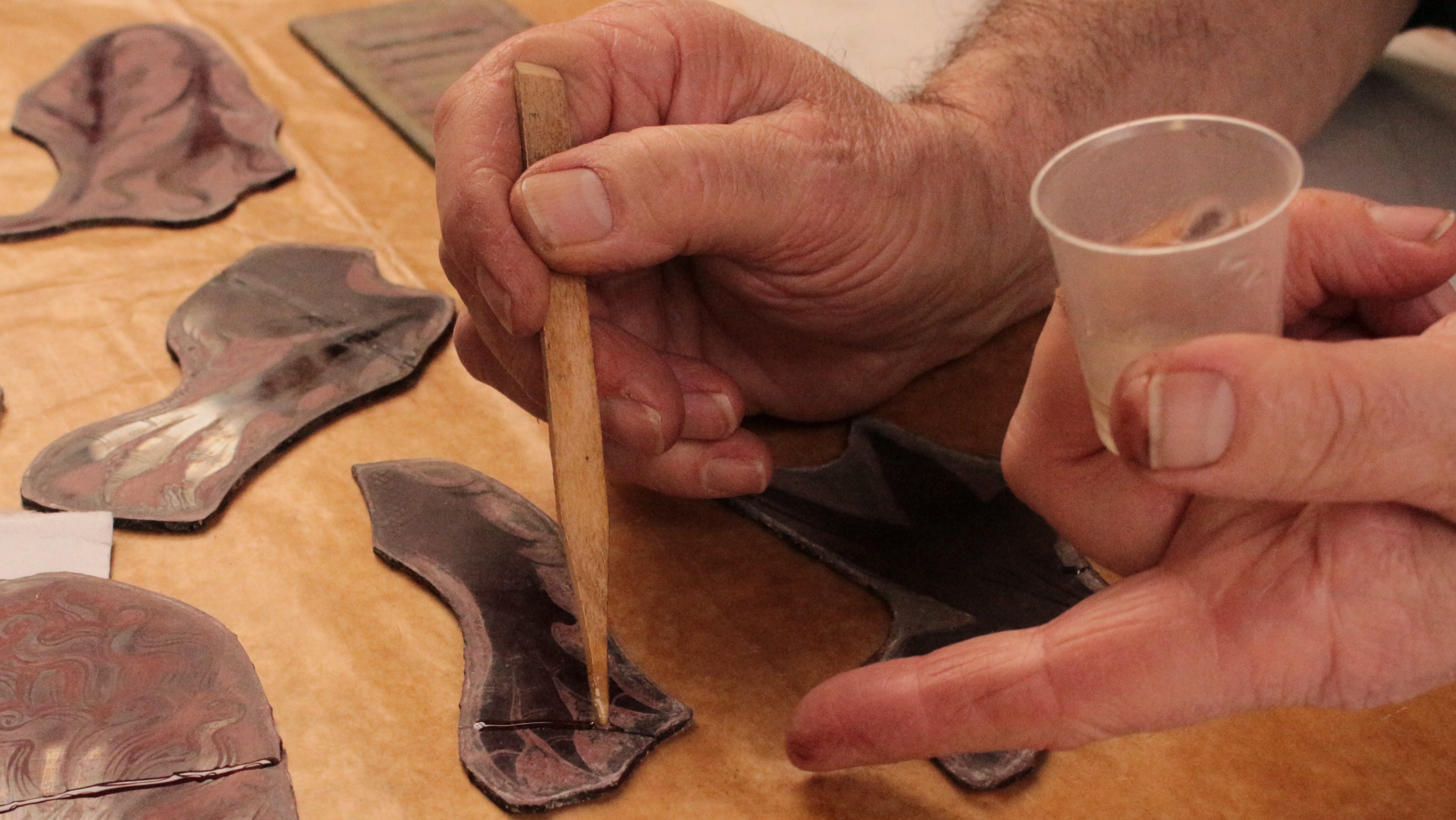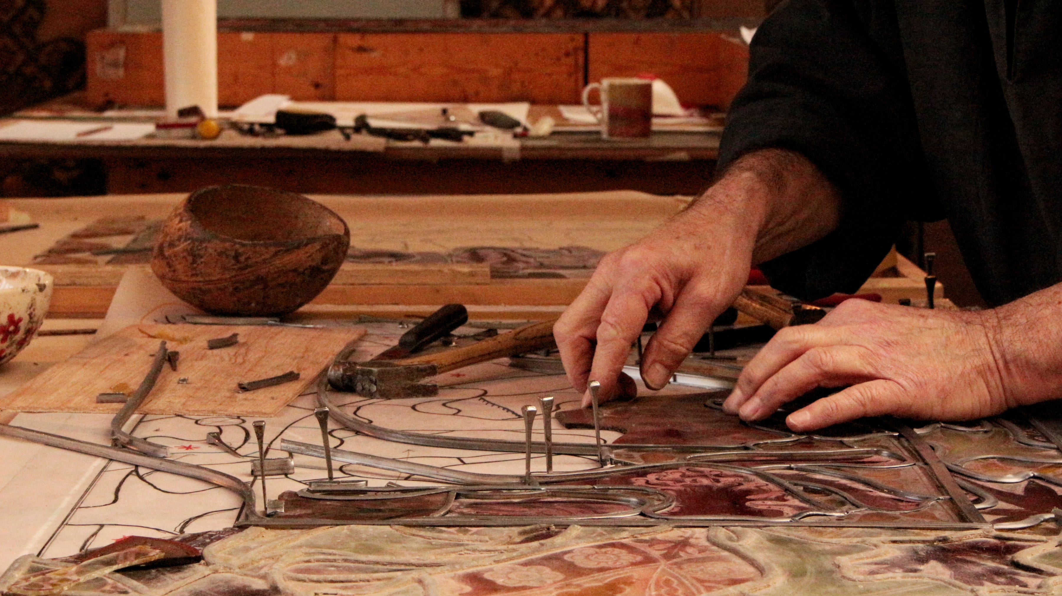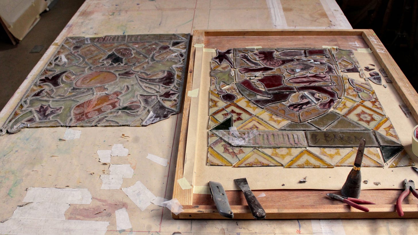 After we had re-cut a missing piece of glass and drawn a suitable design, you saw us paint and distress a fearsome lion, then paint an inscription and also stain it—both these items being stand-ins for a host of other pieces which also needed counterfeiting because they had been lost. (You can confidently infer we do not belong to that school of conservation whose members write long monographs to denounce this type of forgery. In my darker moments, when the Laudanum wears off, my informal diagnosis is that these scholars cannot paint.)