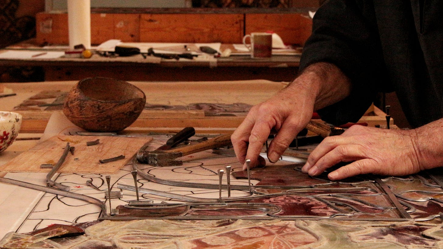 Should you wish to jump ahead, then roughly minute 3 will let you watch the leading; minute 10, the soldering: and minute 17, the puttying, cementing, picking out and polishing. Oh, yes, the polishing. See—you work up quite a glow with polishing in order that the leads are clean and almost black.